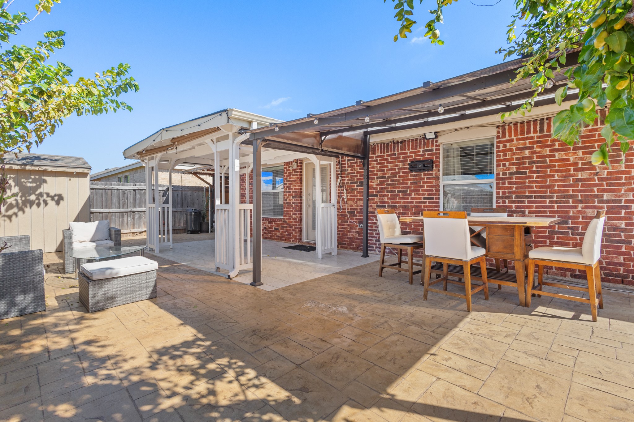 Enjoy the outdoors year-round with a covered patio, lush shade from a mature jujube tree, and even a built-in fish tank that adds a unique touch to your backyard retreat.